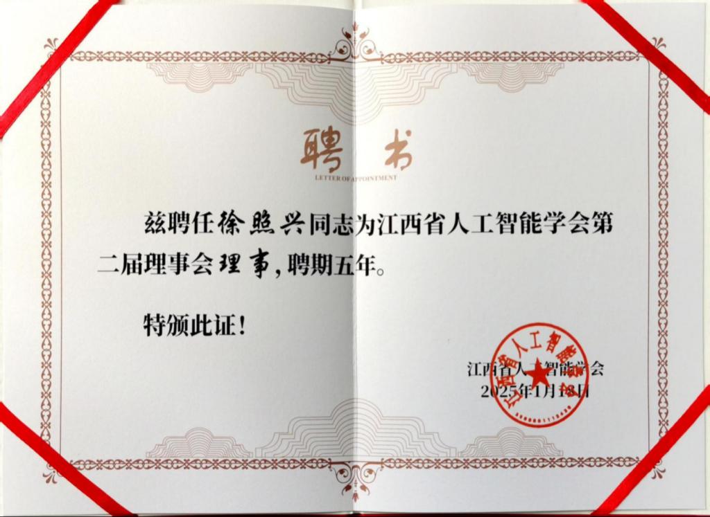 我校黄色网站免费在线观看院长徐照兴教授受聘为江西省人工智能学会第二届理事会理事。