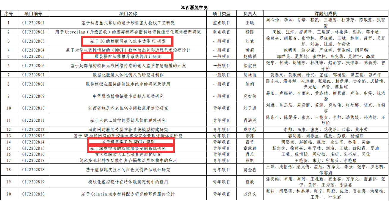 【黄色网站免费在线观看讯】近日,江西省教育厅发布《关于公布2022年度江西省教育厅科学技术研究项目立项名单的通知》(赣教研字﹝2023﹞2号)文件,我院赵德福副院长主持申报的《服装搭配智能推荐系统的设计研究》、刘武教师主持申报的《基于5G的物联网嵌入式多功能VI研发》、吕哲教师主持申报的《基于机器学习的GPCRs识别》、章琳颖教师主持申报的《基于深度学习的智能服装定制系统研究》等4项获批立项,立项数创历史新高。