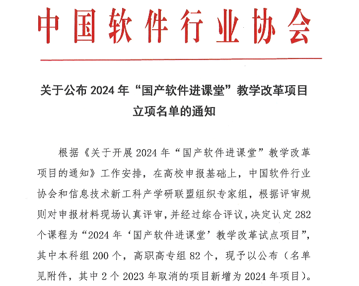 “国产软件进课堂教学改革项目”由中国软件行业协会、信息技术新工科产学研联盟和华为共同发起,是为全面贯彻党的二十大精神,落实教育部等五部门颁发的《普通高等教育学科专业设置调整优化改革方案》,推进高等教育高质量发展,逐步推动国产自主软件技术和软件工具进课堂,进一步推进产教深度融合、创新产教融合模式而展开的。2024年教学改革项目面向本科、高职高专院校的人工智能、云计算、操作系统、数据库、程序设计等课程,突出人工智能+教育,强调专业知识体系与工程应用技术的紧密结合,融入ICT技术和实践,旨在促进高校新型ICT专业建设改革与实践。
