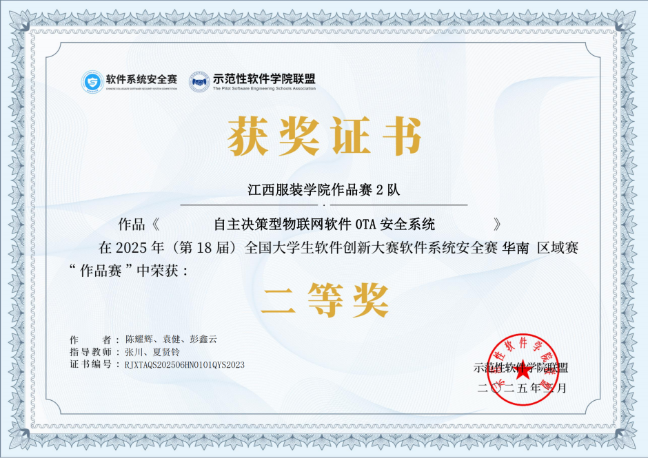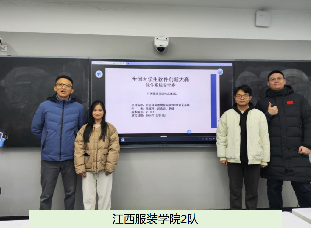 另一支由张川博士和夏贤铃主任指导的江西服装学院2队,队员有陈耀辉、袁健、彭鑫云,他们创新研发了“标志服务器+自主决策”的智能OTA升级方案,采用OTAFlag字段控制与定时轮询机制,成功解决了敏感设备任务中断和长期运行设备升级延迟等难题,为软件系统的稳定运行和高效升级提供了新的思路和方法。