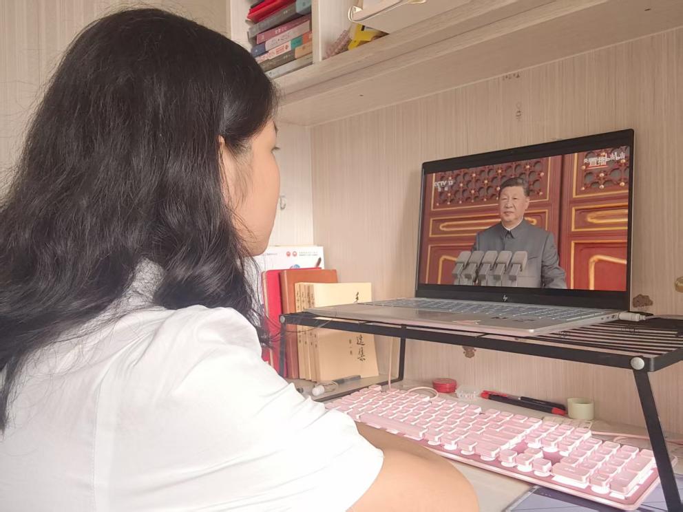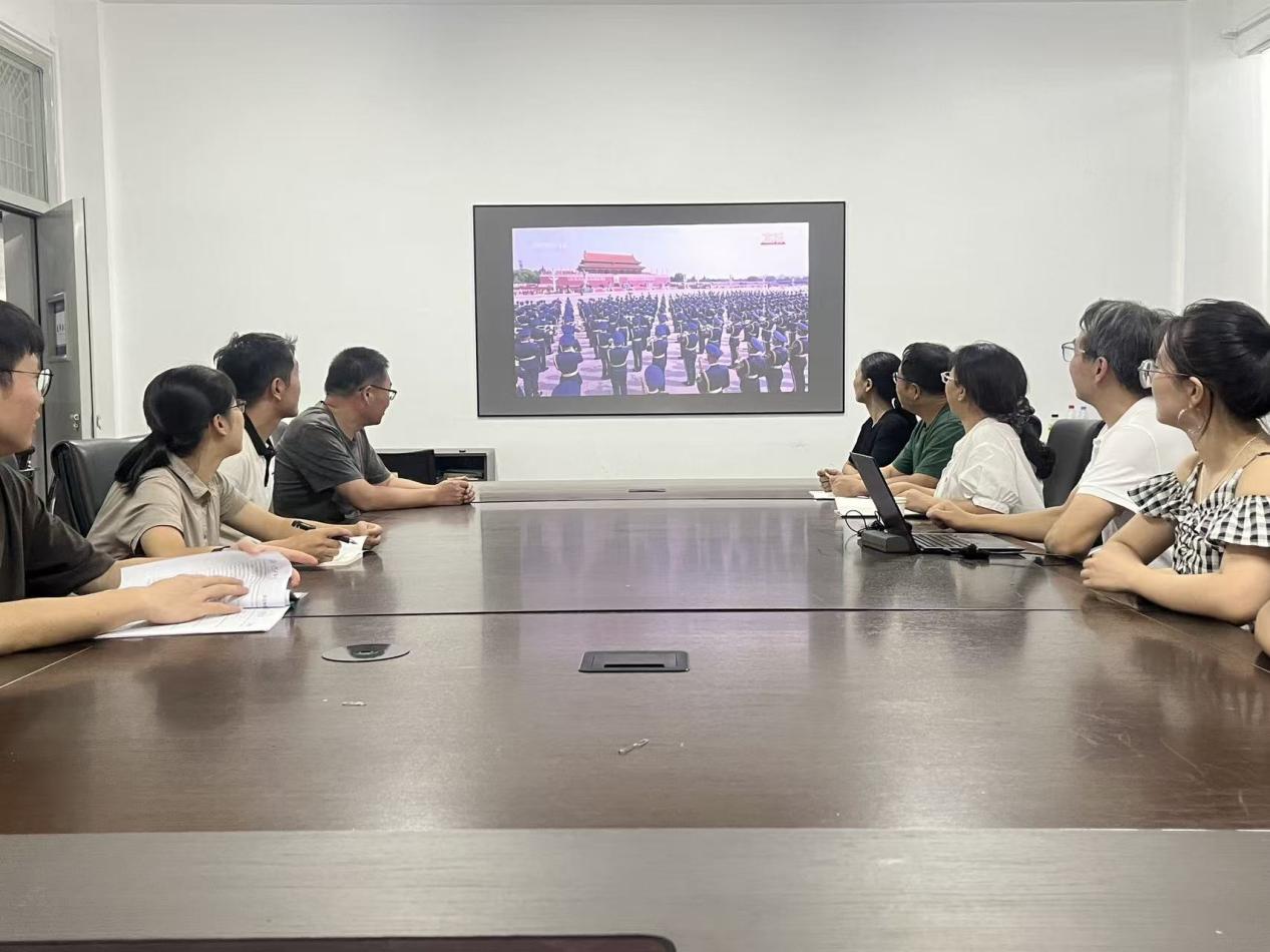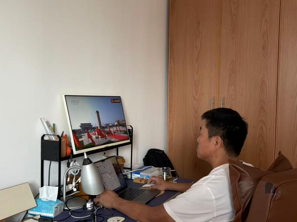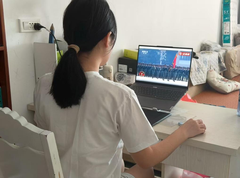阅兵式环节,受阅部队在长安街整齐列阵,中共中央总书记、国家主席、中央军委主席习近平乘车检阅,威严的气势透过屏幕传递到每一位师生心中;分列式环节,空中护旗梯队率先登场,直升机组成的多个编队护卫旗帜、编成字符、悬挂标语,生动展现国家在党的领导下走向繁荣昌盛的壮阔图景,引得师生们纷纷点赞。随后,徒步方队迈着铿锵步伐昂首前行,战旗方队承载着历史荣光徐徐通过,装备方队尽显大国重器风采,空中梯队划出壮丽航迹,一幕幕震撼场景让屏幕前的师生们心潮澎湃,深切感受到祖国的强大与和平的珍贵。