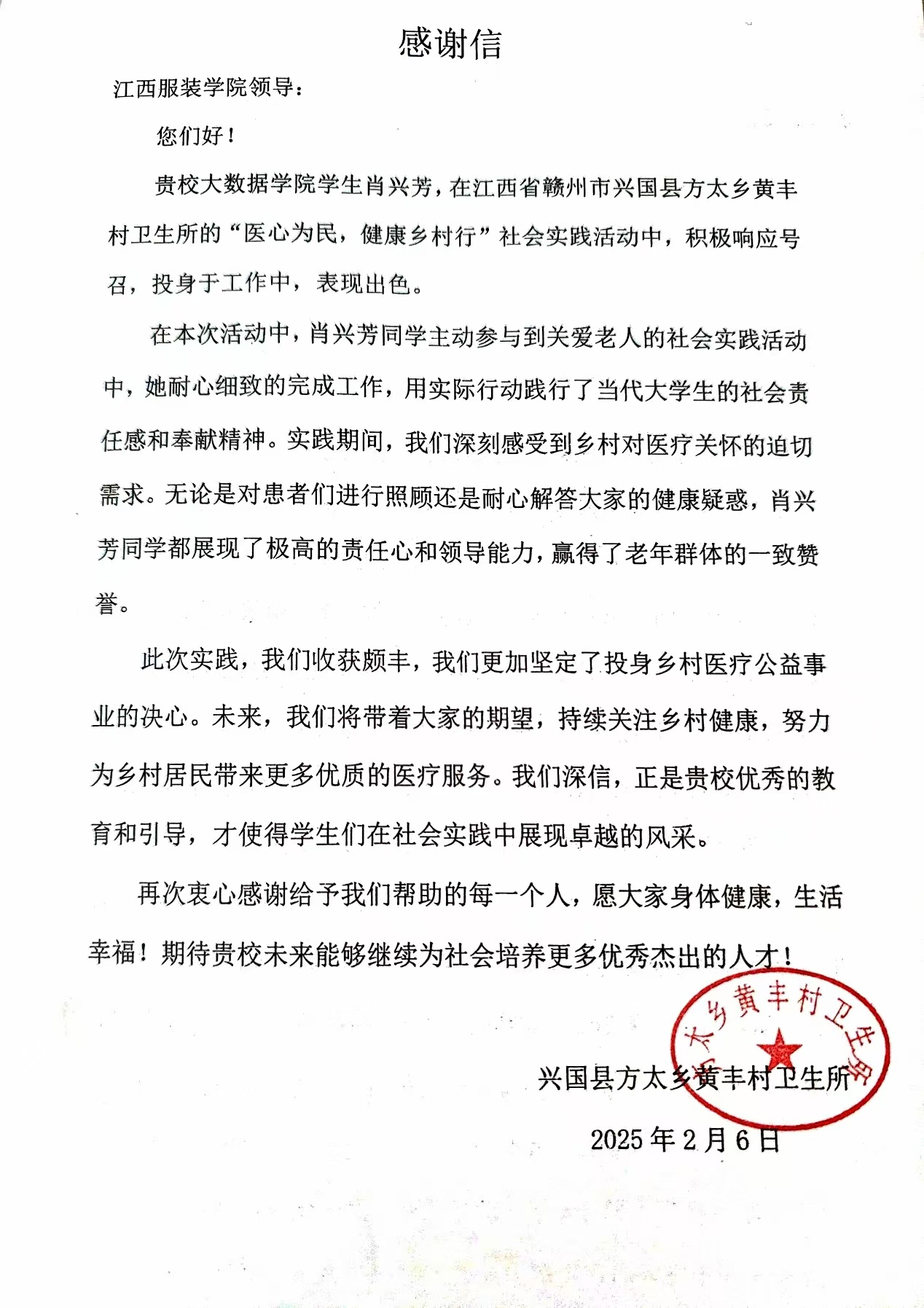 肖兴芳同学用自己的行动,在黄丰村卫生所留下了温暖的印记,以无私奉献之姿,投身社会公益,以小我之力,成就大众之福。作为大学生,我们当以她为榜样,将这份热忱内化于心,外化于行,踊跃参与社会实践,为家乡建设贡献自己的力量,用实际行动诠释青年担当。