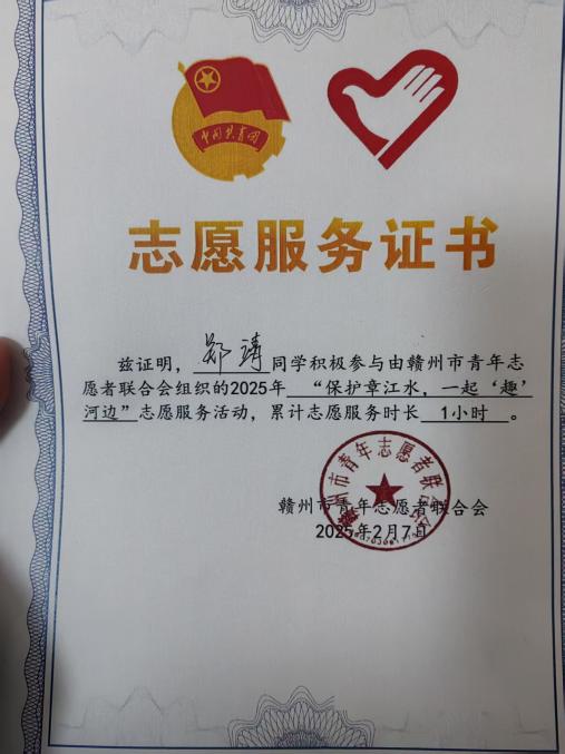 “时代在召唤担当,民族的振兴寄望于青年的肩头。”在这个寒假,郑靖积极响应时代的号召,投身于江西省赣州市章贡区黄金广场举办的“河小青”活动,致力于家乡水域的保护事业,身体力行地践行着青年的责任与使命。