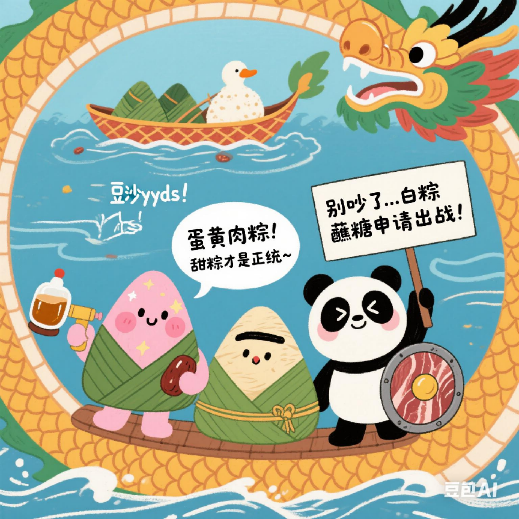 作品亮点:这组插画采用可爱风格,配色明快,构图新颖。互动文字气泡,增添了趣味性,生动展现了端午节的欢乐氛围。