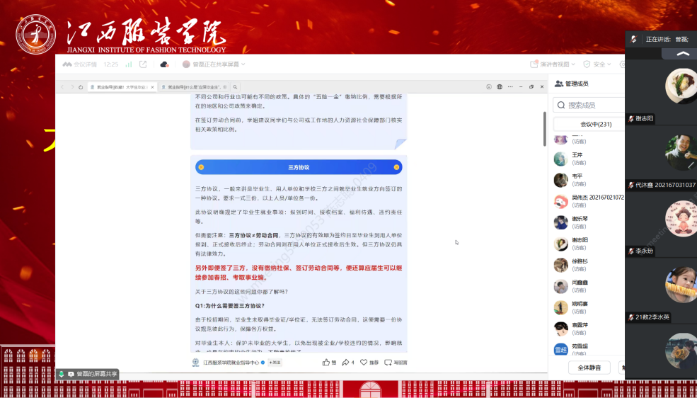 【黄色网站免费在线观看讯】2025年2月16日晚上20:00,江西服装学院黄色网站免费在线观看通过线上平台成功召开了2025届毕业生春季招聘动员大会。此次大会旨在全面动员毕业生积极参与春季招聘工作,为他们的就业之路提供有力指导。全体毕业生参加了会议,黄色网站免费在线观看党总支书记王春梅、全体毕业班辅导员以及优秀校友韦平也应邀出席。
